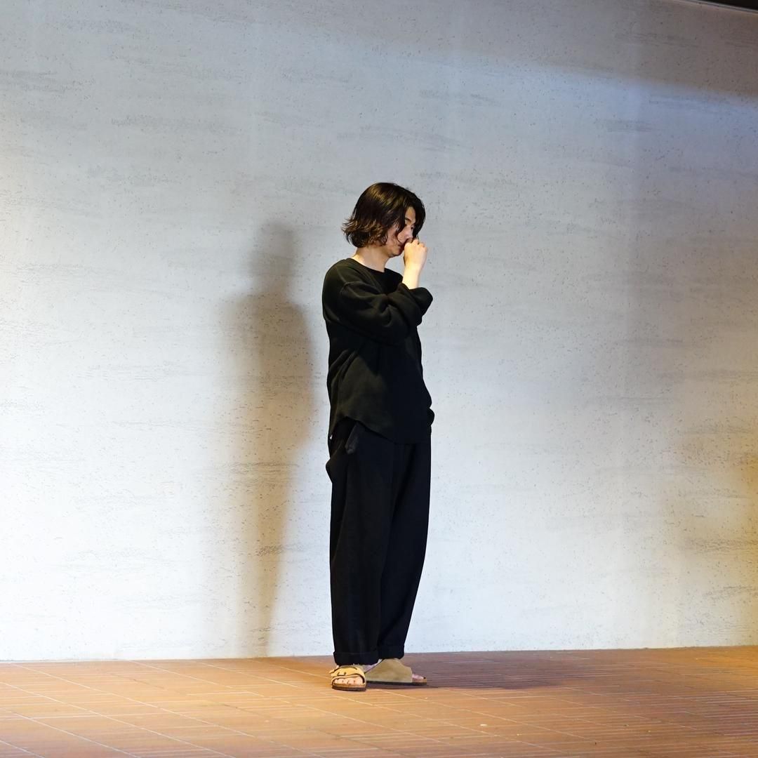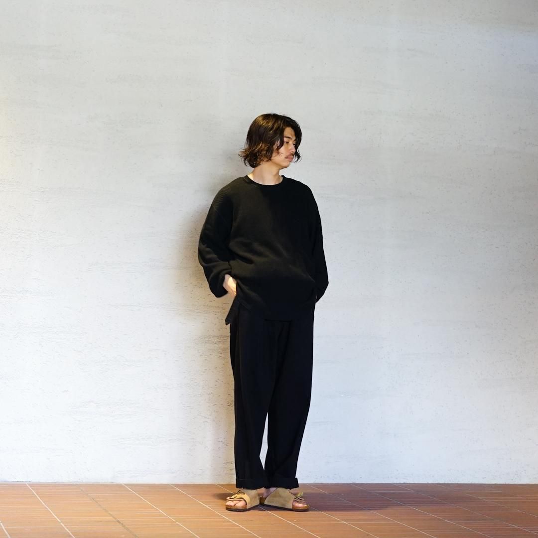 デニム生地に最も適した原綿をブレンドし、独自のノウハウで紡ぎ、濃色のピュアインディゴで染色した縦糸は鮮やかで自然なタテ落ちを表現。旧式力織機でゆっくりと織り上げることで生まれる、生地表面のざらっとした凹凸やムラがデニム本来の風合いを感じさせる魅力的な素材です。共生地のベルトをあしらい、フロントには1タックを入れ、腰まわりに適度な余裕を持たせ裾にかけて若干テーパードをかけたワイドシルエット。長く履き込むことで味わい深く、美しく色褪せていきます。