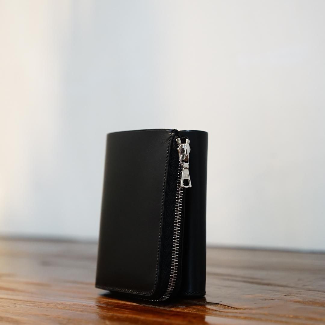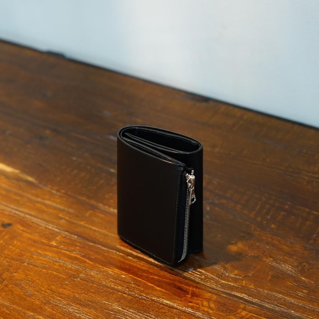 コンパクトながらも機能性抜群の三つ折り財布。コインケース部分のファスナーはL字になっているため取り出しやすく、カードの収納ポケットも付いています。滑らかなレザーの質感が上品でクリーンな印象。